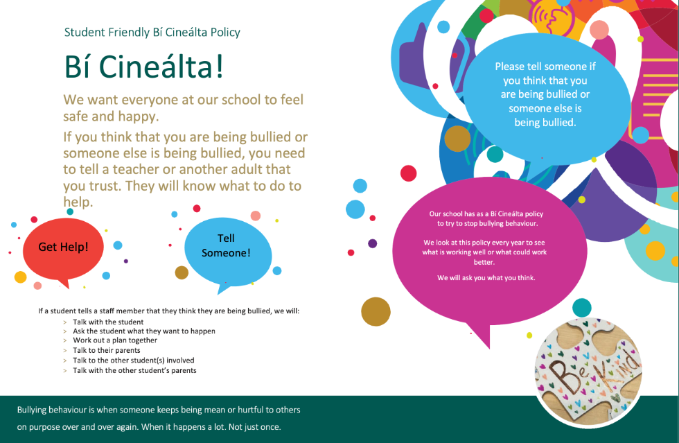 Our Bí Cineálta policy is in the policies tab on the school website for reference. As well as our Student-Friendly poster.